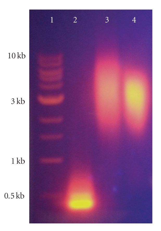 Tris-acetate-EDTA buffer containing ethidium bromide for DNA visualization; 80 V potential difference). A 1-kb DNA