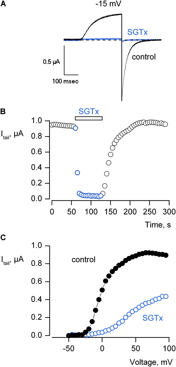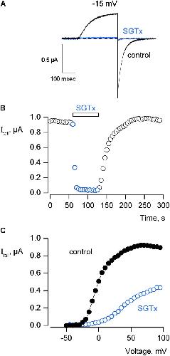 Figure 2. . Inhibition of the Kv2.1 channel by SGTx. (A) Current records were elicited by depolarization to −15 mV in the absence (black trace) and presence (blue trace) of 2.5 μM SGTx. Holding voltage was −90 mV and tail voltage was −50 mV. Dashed line indicates the level of zero current. (B) Time course for inhibition of the Kv2.1 channel by 2.5 μM SGTx. Current records were elicited by depolarizations to −15 mV every 5 s. Holding voltage was −90 mV and tail voltage was −50 mV. Same cell as in A. (C) Voltage-activation relations in the absence and presence of 10 μM SGTx. Tail currents obtained following various strength depolarizations were averaged for 0.4 ms beginning 3.4 ms after repolarization to−50 mV. Holding voltage was −90 mV and tail voltage was −50 mV. Same subtraction protocol as in A. In all cases, leak, background, and capacitive currents were subtracted after blocking the channel with agitoxin-2.