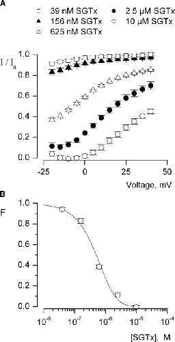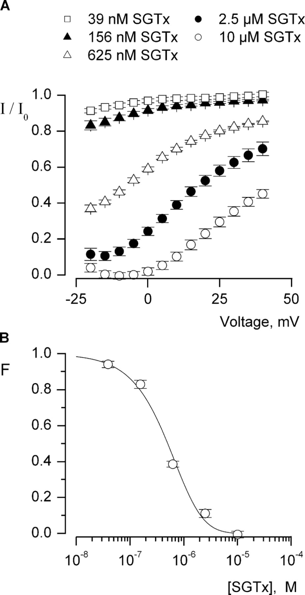 Figure 3. . Concentration dependence for fractional occupancy of the Kv2.1 channel by SGTx. (A) Fraction of uninhibited tail currents in the presence of various concentrations of SGTx. Currents were elicited by depolarization to voltages between−25 and +40 mV (5-mV increments) from a holding potential of −90 mV and a tail voltage of −50 mV. I and I0 represent tail currents in the presence and absence of SGTx, respectively, measured 2.3 ms after repolarization to −50 mV and averaged over 0.3 ms. Symbols represent mean ± SEM for 5–10 cells at each concentration. (B) Concentration dependence for fractional occupancy of the Kv 2.1 channel by SGTx. Plot of fraction unbound (F) for varying concentrations of SGTx. Fraction unbound is the fraction of uninhibited tail current for weak depolarizations (taken from −20 to −10 mV). Data points are mean ± SEM for 7 to 11 cells at each concentration of toxin. Solid line is a fit of F = (1 − p)4 to the data, where F is the probability of having a channel with no SGTx bound (with each channel having four equivalent and independent binding sites) and p = [SGTx]/[SGTx] + Kd with a Kd of 2.7 μM.