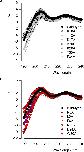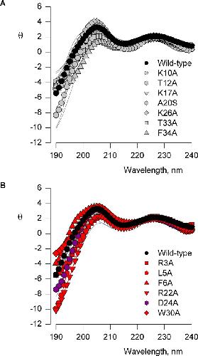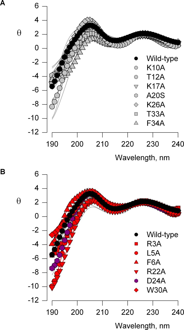 Figure 5. . Circular dichroism spectra for SGTx mutants. Ellipticity (θ) plotted against wavelength for wild-type SGTx (filled black circles) and 26 SGTx mutants (light gray lines). θ (× 103) has units of deg cm2 dmol−1. In A, seven mutants are shown in gray symbols where |ΔΔG| < 1 kcal mol−1 and in B, six mutants are shown in red or purple where |ΔΔG| > 1.5 kcal mol−1. The red residues have increased Kd values while the purple residue has a decreased Kd value.