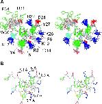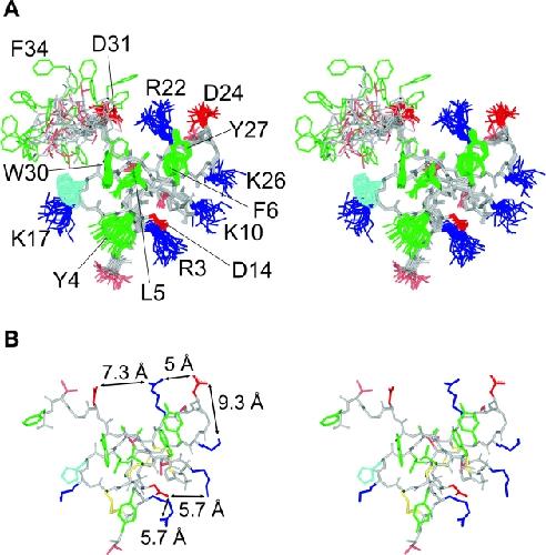 Figure 7. . Position of polar residues in SGTx. (A) Stereo pairs of the 20 final converged structures of SGTx shown as a stick representation. Side chain colors are as follows: green for hydrophobic, dark blue for basic, light blue for His, red for acidic, and pink for both Ser and Thr. Backbone atoms are colored light gray. (B) Stereo pair of the lowest XPLOR-energy structure of SGTx.