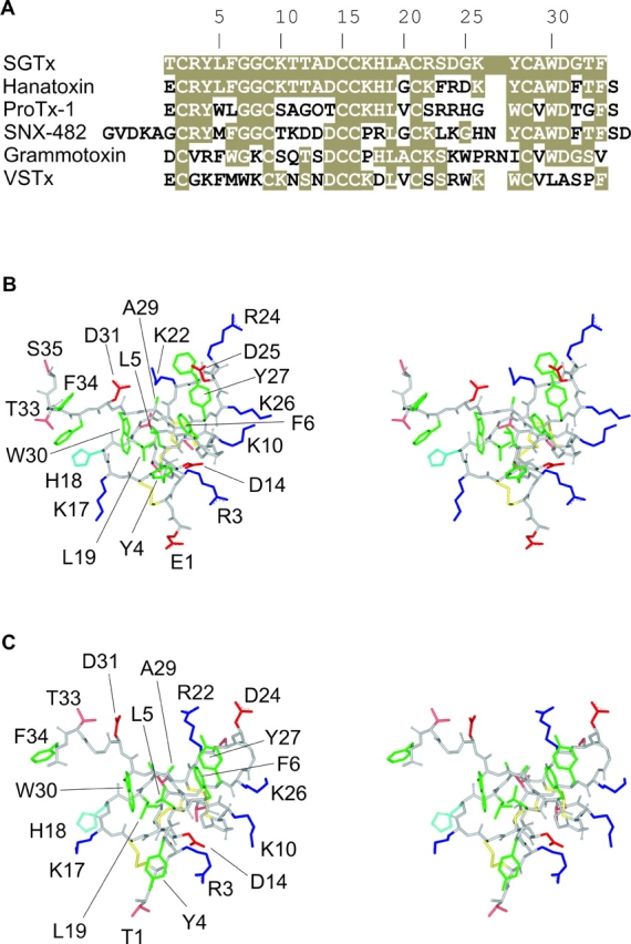 Figure 1. . Structures of toxins interacting with the voltage-sensors. (A) Sequence alignment for toxins interacting with voltage sensors. Tan shading indicates similarity to SGTx. (B) Stereo views of the hanatoxin NMR solution structure (PDB accession code 1D1H) shown as a stick model. Side chain coloring as follows: hydrophobic (green), basic (blue), His (light blue), acidic (red), both Ser and Thr (pink), and disulfide bonds in yellow. Backbone atoms are colored light gray. (C) Stereo views of the SGTx NMR solution structure (PDB accession code 1LA4) shown as a stick model. Same color scheme as in B. Structures here and in all subsequent figures were generated using DS Viewer Pro (Accelrys).