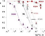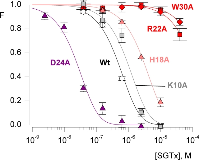 Figure 4. . Concentration dependence for fractional occupancy of the Kv2.1 channel by SGTx mutants. Fraction unbound (F) plotted as a function of SGTx concentration for the wild-type toxin and five Ala mutants. Determinations of F and fitting of a four site model to the data are as described in text and Fig 3. Data points are mean ± SEM for 3 to 11 cells at each toxin concentration. K10A (light gray) is an example of a mutant that does not significantly alter Kd (|ΔΔG| < 1 kcal mol−1). H18A (pink) is an example of a mutant that displays a moderately higher Kd (|ΔΔG| = 1–1.5 kcal mol−1), and both R22A and W30A (red) are examples of mutants with dramatically higher Kd values (|ΔΔG| > 1.5 kcal mol−1). D24A (purple) is an example of a mutant that displays a lower Kd. See Table I for Kd and ΔΔG values for all mutants.