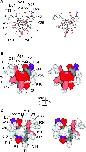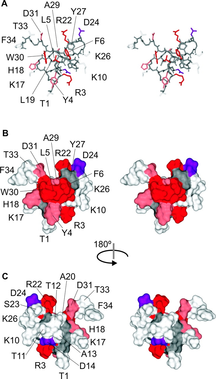 Figure 6. . Mapping of perturbations onto the SGTx structure. (A) Stereo pair of the SGTx NMR solution structure shown as a stick representation. Backbone atoms and unstudied residues (L19, Y27, and 6 Cys) are colored dark gray. Mutants that do not significantly alter Kd (|ΔΔG| < 1 kcal mol−1) are colored light gray. Mutants that display weaker binding affinity are colored pink if |ΔΔG| = 1–1.5 kcal mol−1 and red if |ΔΔG| > 1.5 kcal mol−1. Two mutants displaying stronger binding affinity are colored purple. See Table I for Kd and ΔΔG values for all mutants. (B) Stereo pair of the SGTx structure shown as surface renderings with a probe radius of 1 Å. Same coloring scheme as in A. (C) Stereo surface renderings as in B except that the structure was rotated 180° about the indicated axis.