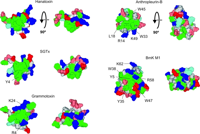 Figure 8. . Structures of toxins that bind to voltage-sensors. Surface renderings of five toxins that bind to voltage-sensors in voltage-gated ion channels. Structures to the right were obtained by rotating structures on the left by 90° about the axis shown. Probe radius is 1 Å and coloring as in Fig 7. Structures of hanatoxin, SGTx, grammotoxin (1KOZ), and anthropleurin-B (1APF) were determined using NMR while the structure of BmK M1 (1SN1) was determined using X-ray diffraction. Mutation of residues labeled in anthropleurin-B and BmK M1 cause decreases in toxin binding to Nav channels.