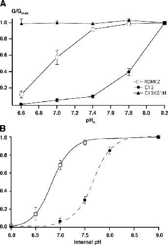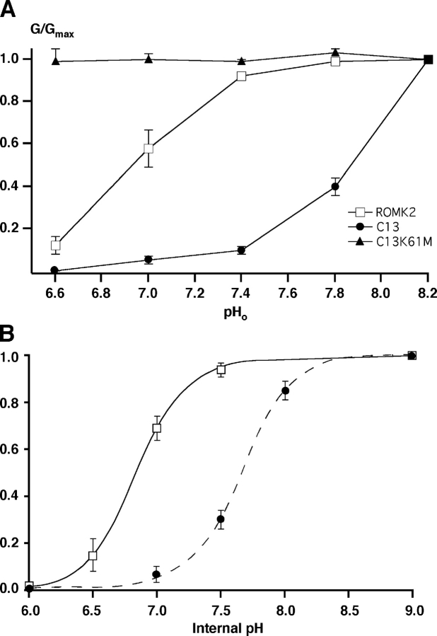 Figure 3. . pH dependence of inward conductance through ROMK2, C13, and ROMK2 K61M. (A) Conductance was measured in experiments similar to those shown in Fig. 2. Values were normalized to those at pH 8.2 and plotted as a function of external pH. Data represent means ± SEM for 4–6 oocytes. (B) Conductance measured in cut-open oocytes, expressing either ROMK2 or C13. Data were normalized to values obtained at pHi = 9. ROMK2: open squares, solid line, pKa = 6.8 ± .03, Hill coefficient 2.2 ± 0.3 (n = 4). C13: solid circles, dashed line, pKa = 7.7 ± .04, Hill coefficient 2.3 ± 0.3 (n = 7).