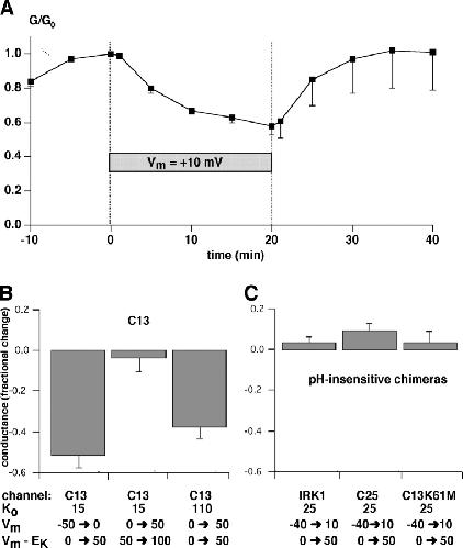 Figure 10. . Effect of a depolarizing holding potential on the inward conductance of strongly rectifying channels. (A) Time course of inward conductance changes with C13. Oocytes were superfused with solution containing 25 mM K. Inward conductances were measured between −60 and −80 mV with a holding potential of −40 mV, close to EK and the resting membrane potential. After a steady-state was achieved, the holding potential was changed to +10 mV, and the conductance continued measured at the same test potentials. After 20 min the holding potential was returned to −40 mV. Data represent means ± SEM for five oocytes. (B) Summary of experiments similar to those shown in A using C13 under different initial conditions, including initial holding potential and K+o concentration. (C) Summary of experiments similar to those shown in A using different pH-insensitive channels. The plots in B and C show fractional changes in conductance in response to a 50-mV depolarization. Data represent means ± SEM for 4–6 oocytes.