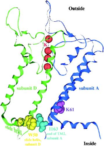 Figure 13. . Possible interactions between I163 at the end of the second transmembrane helix of subunit A with residues (e.g., W50) on the slide helix of subunit D. The relevant residues for Kir 1.1 pH gating (space-filled) are superimposed on the crystal structure of a KirBac1.1. Only 2 of 4 KirBac1.1 subunits are shown.