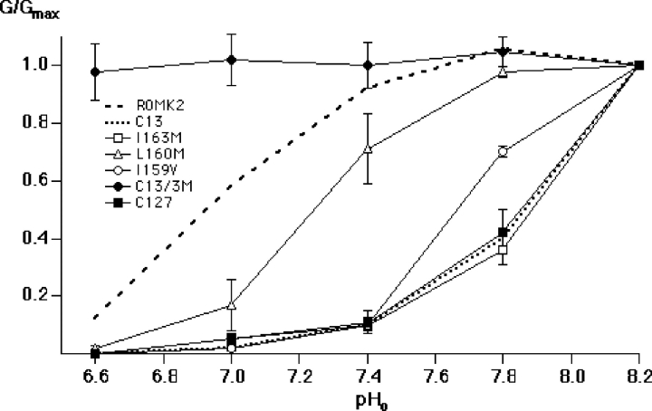 Figure 4. . pH dependence of inward conductance through the ROMK2 mutants I163M, L160M, and I159V and the C13 mutant “C13-3M” (C13 V159I/M160L/M163I). Conductance was measured and plotted as in Fig. 3 A. Data represent means ± SEM for 4–5 oocytes. Dashed and dotted lines show data for ROMK2 and C13, respectively, from Fig. 3 A.