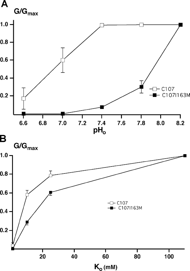 Figure 7. . Effect of pH and Ko+ on inward conductance through C107 and C107 I163M. (A) pH dependence. (B) Ko+ dependence. Data represent means ± SEM for five oocytes.
