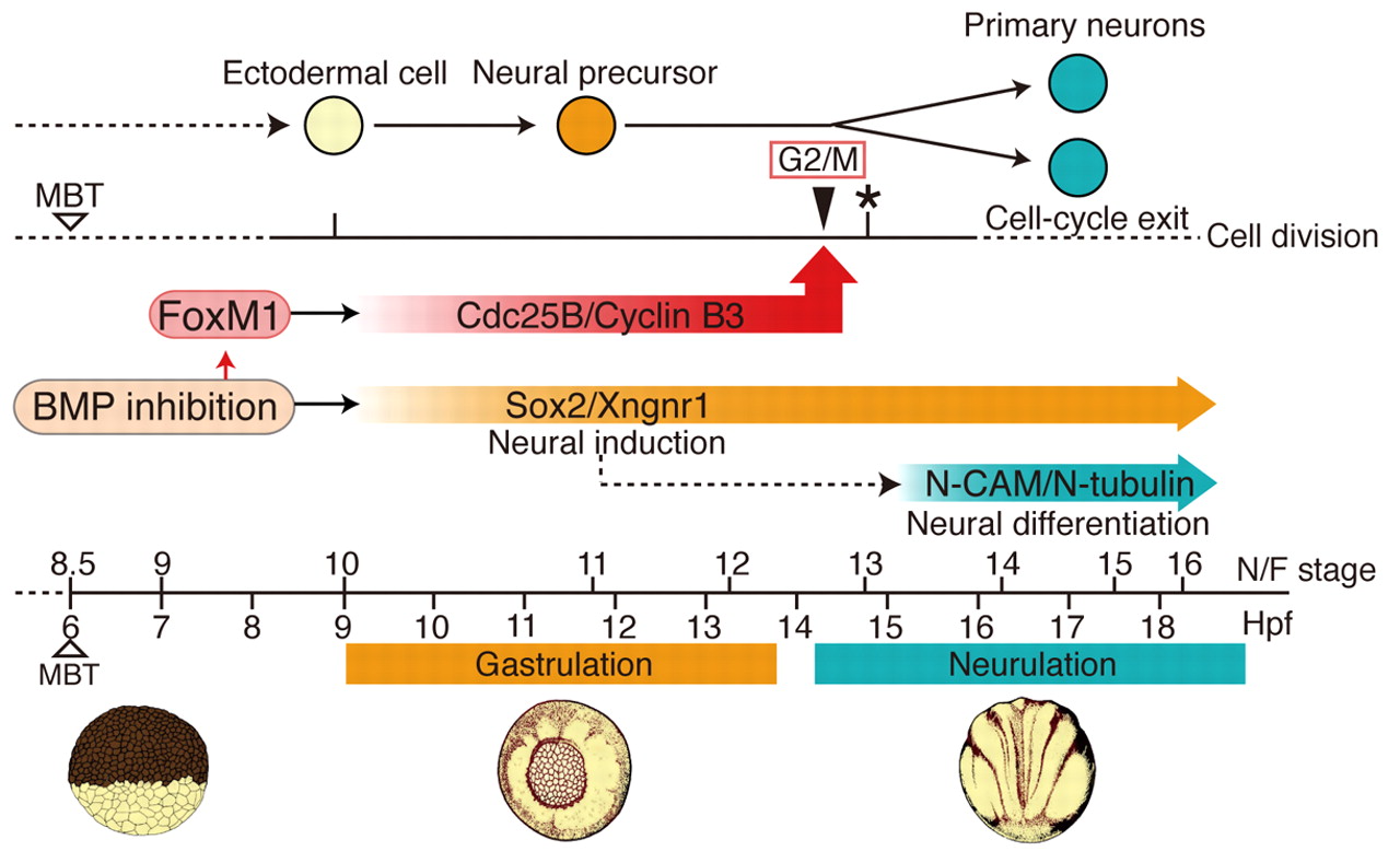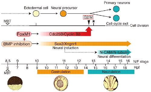 Figure 5. Model for the role of FoxM1 in primary neuronal differentiation in Xenopus embryos. BMP inhibition induces not only neural induction but also FoxM1 expression during gastrulation. FoxM1 activates the expression of G2-M cell-cycle regulators, such as Cdc25B and cyclin B3, and thereby drives the immediate, preceding cell division(s) of neuronal precursors for their differentiation. The temporal expression patterns of Cdc25B and cyclin B3 are from Fig. 4A and Fig. S4A in the supplementary material, whereas those of Sox2, Xngnr1, N-CAM and N-tubulin are from the published literature (as cited in the text) and Fig. S5 in the supplementary material. The final division (*) of neuronal precursors presumably occurs between st. 13 and 16, depending on the cells (Hartenstein, 1989), but mainly around st. 13 (Lamborghini, 1980). MBT, midblastula transition; G2/M, G2-M transition of the cell cycle; Hpf, hours post-fertilization