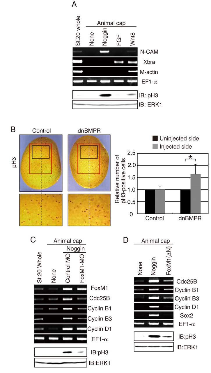Figure 2,. Induction of both cell proliferation and expression of FoxM1 and its target G2-M cell-cycle regulators by BMP inhibition. (A) Animal caps were isolated from late blastula Xenopus embryos (st. 9) pre-injected with Noggin mRNA (100 pg) or Wnt8 mRNA (100 pg) at the one-cell stage; for FGF signaling, animal caps (from uninjected embryos) were treated with bFGF (100 ng/ml). The animal caps were cultured until sibling control embryos reached st. 20 and were then analyzed by RT-PCR (upper panel) or immunoblotting (lower panel). N-CAM, Xbra and M-actin are downstream markers of Noggin, FGF and Wnt, respectively. (B) Embryos pre-injected with lacZ mRNA (100 pg) together with or without dnBMPR mRNA (500 pg) at one animal-ventral blastomere at the eight-cell stage were cultured until st. 14. Embryos were then processed and analyzed as in Fig. 1B, except that the numbers of pH3-positive cells on the injected (β-Gal, light blue) and uninjected sides of the ventral region (the area boxed in red) were counted. *P<0.01. (C) Animal caps from the late blastula embryos pre-injected with Noggin mRNA (100 pg) and either control MO or FoxM1-MO (36 ng) at the one-cell stage were cultured as in A and analyzed by RT-PCR (upper panel) or immunoblotting (lower panel). (D) Animal caps pre-treated with Noggin mRNA (100 pg) or FoxM1(ΔN) mRNA (1 ng) were processed as in C.