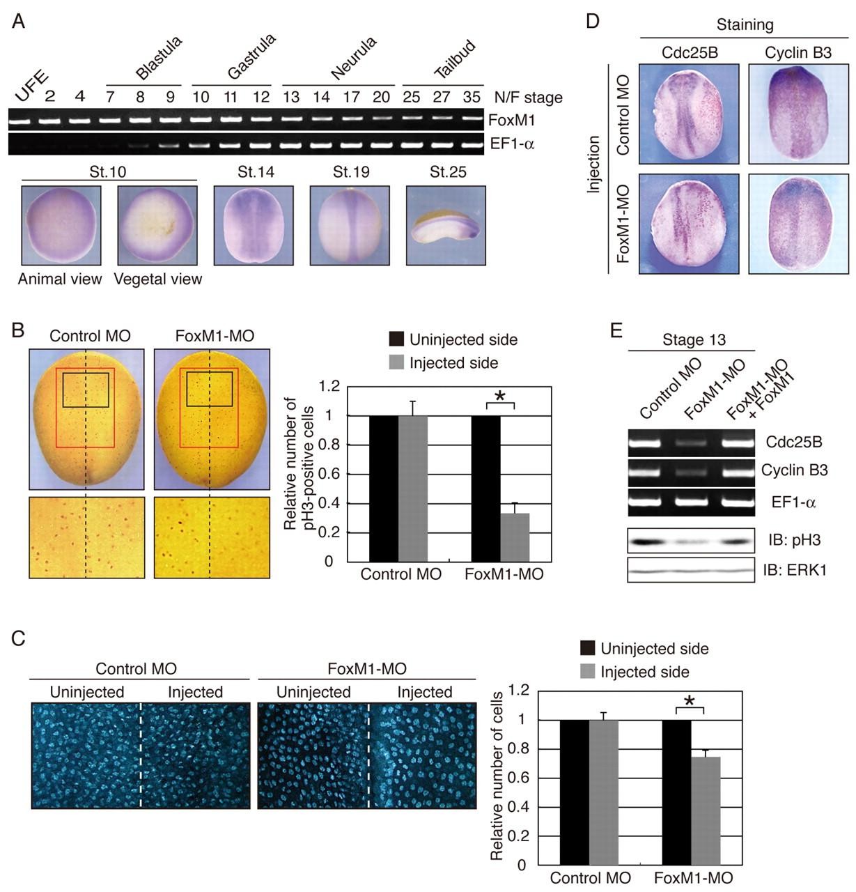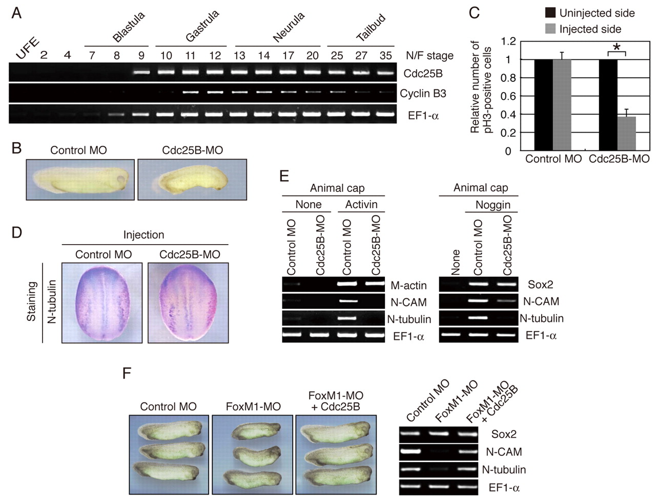 Figure 4. Requirement of FoxM1-dependent G2-M progression for neuronal differentiation. (A) Xenopus embryos were analyzed for Cdc25B and cyclin B3 by RT-PCR. (B) Embryos pre-injected with control MO or Cdc25B-MO (18 ng) at the one-cell stage were cultured until st. 32 and photographed to show morphological phenotypes. (C) Embryos pre-injected with both lacZ mRNA (100 pg) and control MO or Cdc25B-MO (18 ng) at one blastomere at the two-cell stage were fixed at st. 13, immunostained for pH3, and analyzed as in Fig. 1B. *P<0.01. (D) Embryos were co-injected with lacZ mRNA (100 pg) and either control MO or Cdc25B-MO (18 ng) at one blastomere at the two-cell stage, cultured until st. 14, and analyzed by WISH. In each panel, the injected side (β-Gal, red) of the embryo is on the right (dorsal view, anterior up). (E) Animal caps from the late blastula embryos pre-injected with control MO or Cdc25B-MO (36 ng) at the one-cell stage were cultured with or without Activin (200 pM) until sibling embryos reached st. 20 and were then analyzed by RT-PCR (left panel). Animal caps pre-treated with Noggin mRNA (100 pg) and either control MO or Cdc25B-MO (36 ng) were cultured and analyzed by RT-PCR (right panel). (F) Embryos pre-injected with control MO or FoxM1-MO (36 ng) together with or without Cdc25B mRNA (200 pg) at the one-cell stage were cultured until st. 32 and photographed (left panels). For RT-PCR analysis (right panel), embryos were collected at st. 15.