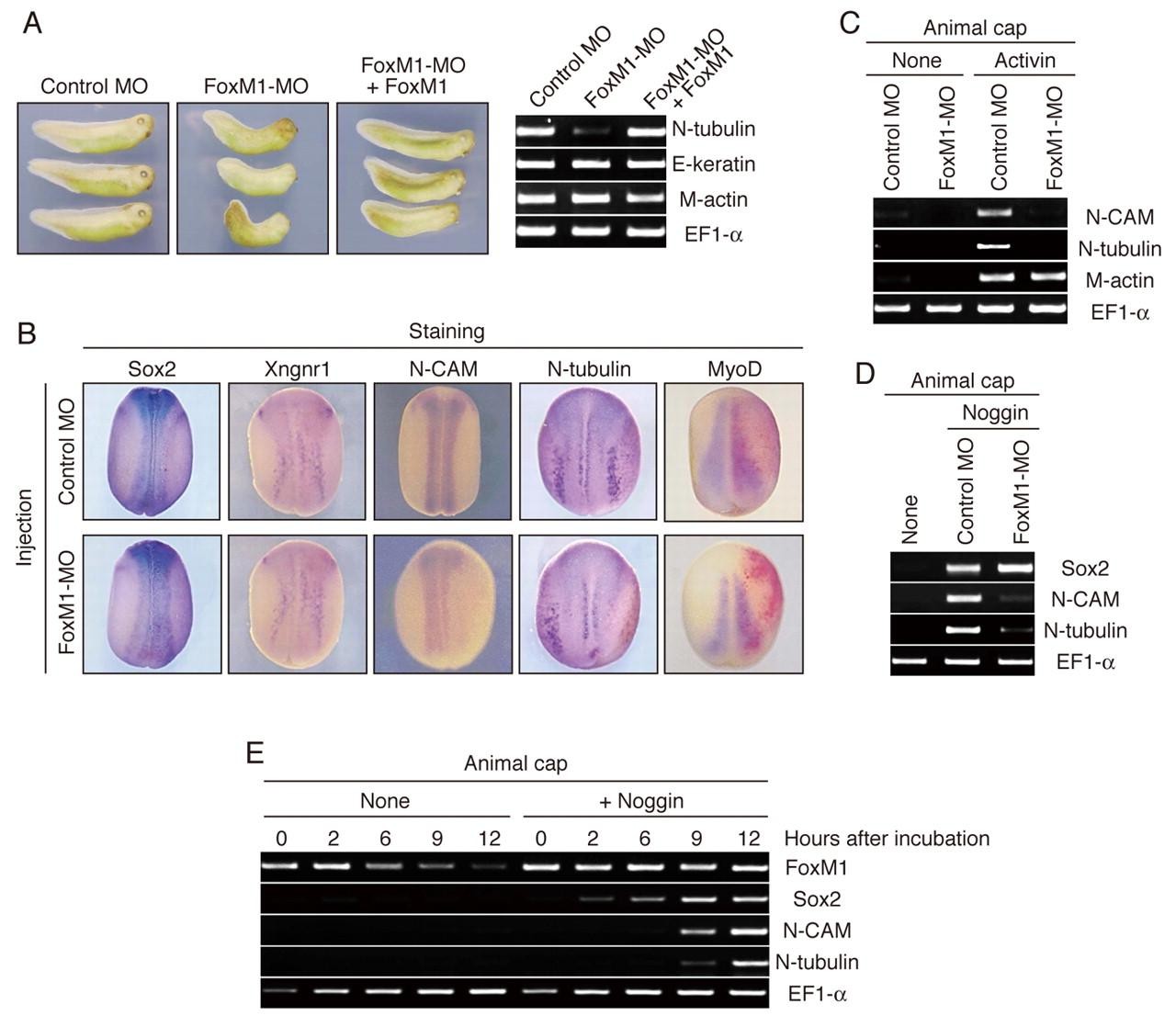Fig. 3. Requirement of FoxM1 for neuronal differentiation but not specification. (A) Xenopus embryos pre-injected with control MO or FoxM1-MO (36 ng) together with or without FoxM1 mRNA (200 pg) at the one-cell stage were cultured until st. 33 and photographed (left panels). For RT-PCR analysis, embryos were collected at st. 28 (right panel). (B) Embryos injected with lacZ mRNA (100 pg) and either control MO or FoxM1-MO (18 ng) at one blastomere at the two-cell stage were cultured until st. 14 for WISH analysis of Xngnr1, N-tubulin and MyoD, or until st. 16 for analysis of Sox2 and N-CAM. In each panel, the injected side (β-Gal, red) of the embryo is on the right (dorsal view, anterior up). (C) Animal caps from the late blastula embryos pre-injected with control MO or FoxM1-MO (36 ng) at the one-cell stage were cultured with or without Activin (200 pM) until sibling control embryos reached st. 20 and then analyzed by RT-PCR. (D) Animal caps pre-treated with Noggin mRNA (100 pg) and either control MO or FoxM1-MO (36 ng) were cultured and analyzed as in C. (E) Animal caps pre-treated or not with Noggin mRNA (100 pg) were incubated for the indicated times and analyzed by RT-PCR. Whereas FoxM1 expression in control animal caps decreased after 2 hours of incubation, that in Noggin-treated animal caps remained constant until 12 hours of incubation, indicating that the induction of FoxM1 expression by Noggin began after 2 hours of incubation. Note that Sox2 began to be expressed coincidently with FoxM1, whereas expression of N-CAM and N-tubulin began after FoxM1, in Noggin-treated animal caps.