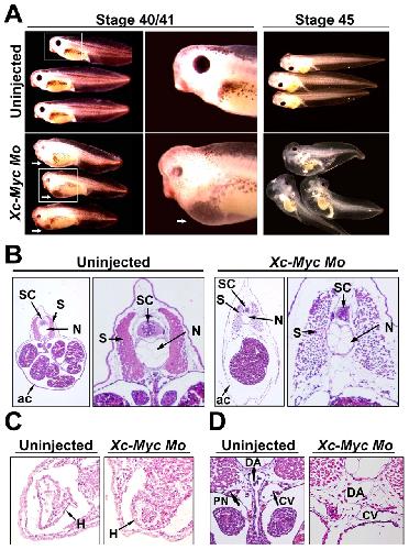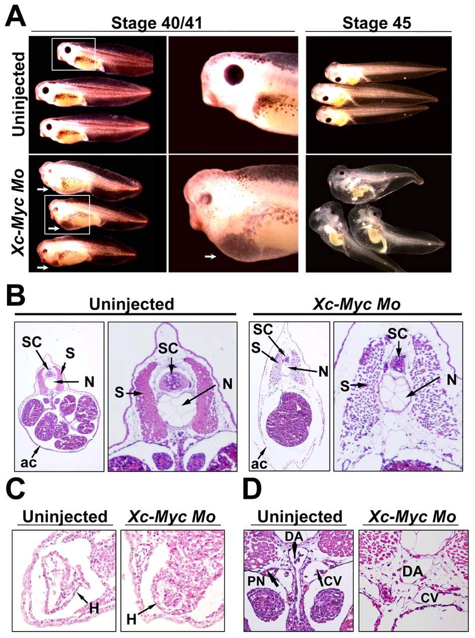 Fig. 2. Knockdown of Xc-Myc provokes edema and compromises organogenesis. (A) Embryos injected with Xc-Myc morpholino (Xc-Myc Mo) at the one-cell stage developed edema in the head and heart region (white arrows). By stage 45 (right panels) massive edema and associated defects in organogenesis were obvious in Xc-Myc knockdown tadpoles (Xc-Myc Mo). (B-D) Histological analysis (stage 37) of Xc-Myc knockdown embryos revealed profound developmental defects: somites (S), spinal cord (SC), notochord (N), abdominal cavity (ac), heart (H), pronephros (PN), dorsal aorta (DA) and cardinal vein (CV). (C) The heart is shown. (D) The region containing the dorsal aorta and cardinal vein.