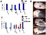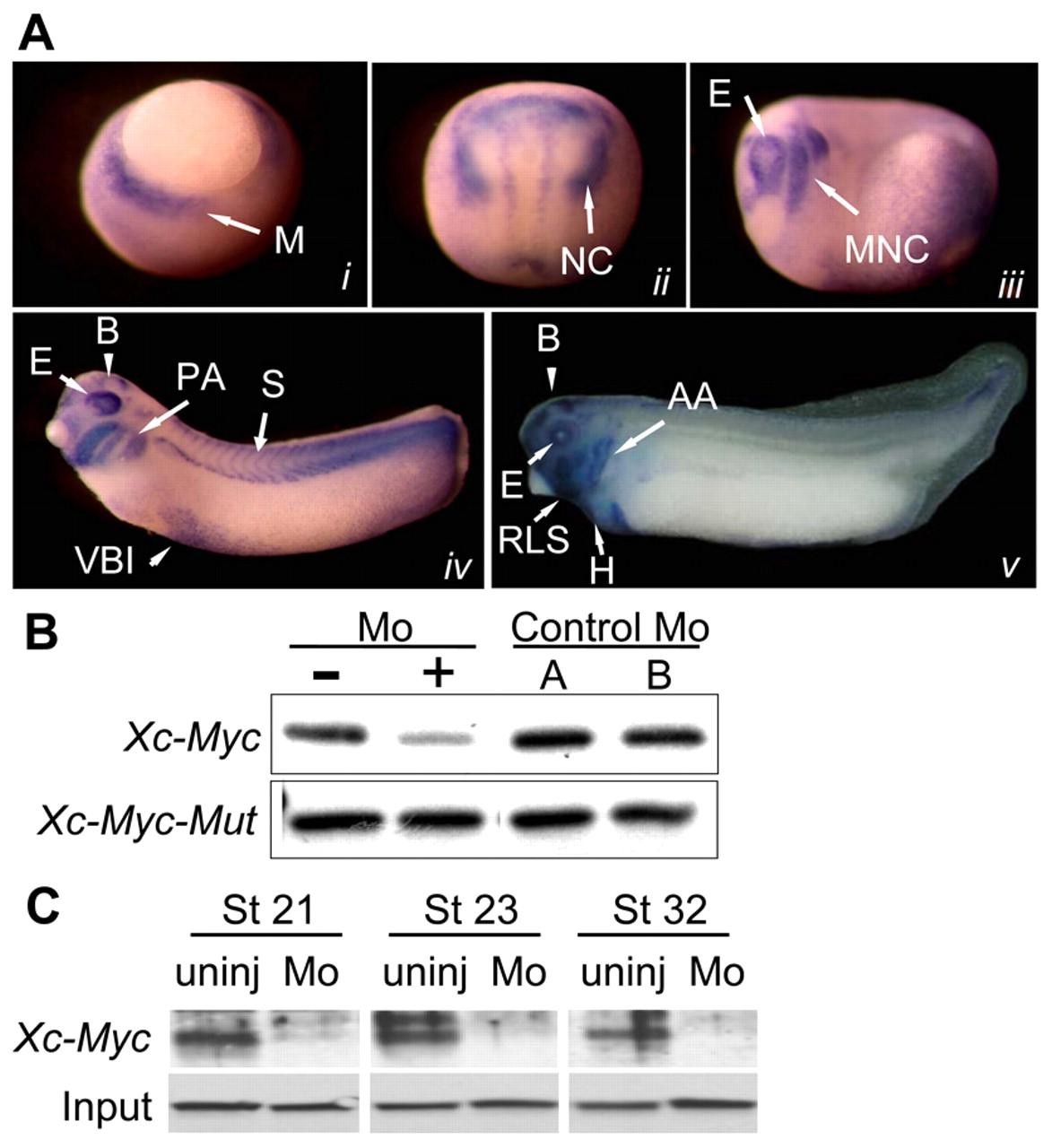 Fig. 1. Xc-Myc expression and morpholino knockdown. (A) In situ hybridization of Xc-Myc expression during development. (i) Gastrula: expression in involuting mesoderm (M) that flanks the yolk plug. (ii) Neurula: expression in anterior region and in the lateral edges of neural crest (NC). (iii) Early tailbud: expression in the developing eye (E) and migratory neural crest cells (MNC). (iv) Tailbud (â¼stages 27/28): expression in eyes (E), brain (B), somites (S), pharyngeal arches (PA) and ventralblood islands (VBI). (v) Stage 35/36: expression is predominant in head and heart region (eyes, E; brain, B; heart, H; rostral lymph sac, RLS; aortic arches, AA). (B) The Xc-Myc morpholino blocks translation of Xc-Myc. In vitro translation of transcripts for wild-type (Xc-Myc) or a morpholino-resistant mutant (Xc-Myc-Mut) in the absence (-) or presence (+) of Xc-Myc morpholino (Mo) is shown. Control morpholinos were non-specific (A) or a scrambled Xc-Myc (B) morpholino. (C) Knockdown of Xc-Myc protein expression in vivo at different stages. Western blot of Xc-Myc expression in embryos injected with Xc-Myc morpholino (Mo); uninjected (uninj); loading control (input).