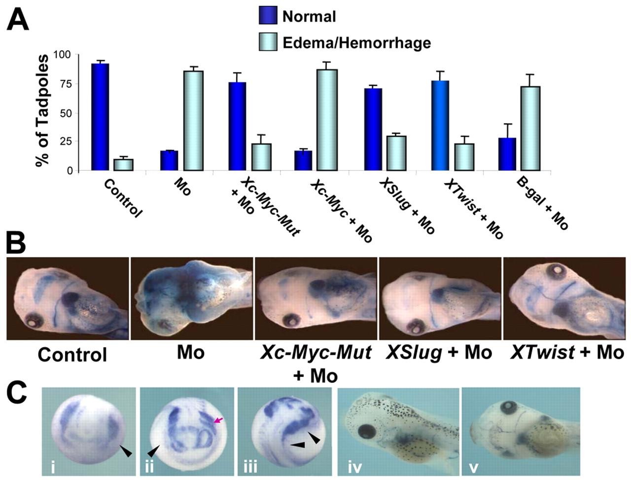 Fig. 6. Slug or Twist rescue the vascular defects provoked by Xc-Myc knockdown. (A) The percentage of embryos that appeared normal (dark-blue bars) or showed edema associated with hemorrhage (light-blue bars) after injection of Xc-Myc morpholino alone or mixed with Xc-Myc-Mut, wild-type Xc-Myc, Slug, Twist orβ -galactosidase mRNAs. (B) Representative images of the results in A. showing the rescue of the Xc-Myc knockdown phenotype by Slug or Twist. (C) One blastomere of a two-cell stage embryo was injected with Slug morpholino. In situ hybridization at the neural tube stage using a probe specific for Xc-Myc showed that knockdown of Slug indeed affects Xc-Myc expression in the region corresponding to the neural crest (i-iii). On the injected side (black arrowheads) an accumulation of Xc-Myc-expressing cells is evident, while on the uninjected side cells expressing Xc-Myc have started to migrate (red arrow). A deviation in the body axis is also evident (ii,iii). Despite affecting Xc-Myc expression during neurulation, knockdown of Slug in two-cell embryos is not sufficient to cause the edema and hemorrhagic phenotype (iv,v), as observed upon Xc-Myc knockdown using Xc-Myc morpholino.