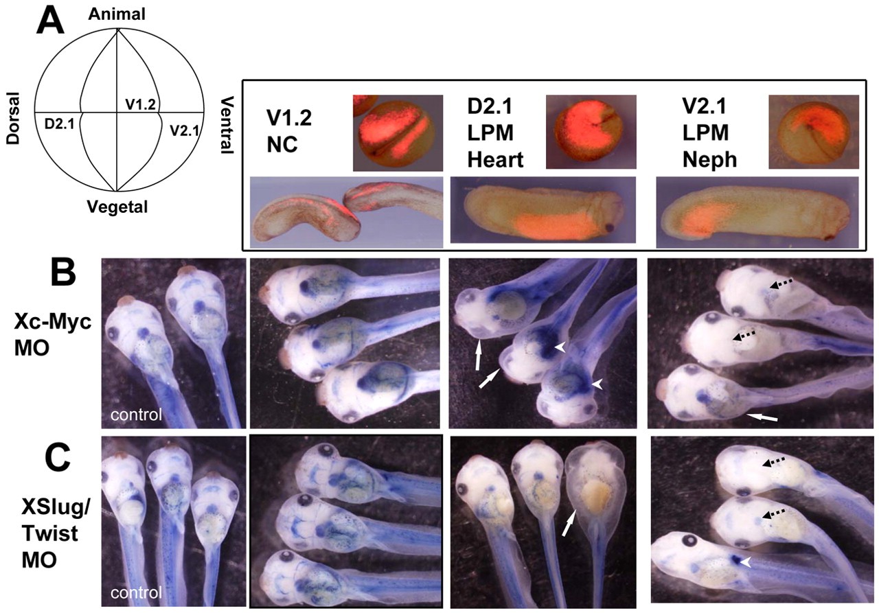 Fig. 7. Xc-Myc or XSlug/XTwist targeted knockdown in lateral plate mesoderm but not the neural crest lineage, provokes edema and hemorrhage. (A) Map showing the blastomeres targeted for knockdown of Xc-Myc or XSlug/XTwist in predominantly neural crest (V1.2) or lateral plate precursors (D2.1 or V2.1). Correct targeting of the morpholinos is shown in the next three images taken at neurula and tailbud when neural crest cells start migrating. NC, neural crest; LPM, lateral plate mesoderm; Neph, nephrotome. (B,C) Embryos were injected with a mixture of either Xc-Myc morpholino (B) or XSlug/XTwist morpholino (C), and were dextran fluorescently labeled with rhodamine. At stage 43, embryos were stained with benzidine to reveal the location of blood. Knockdown of Xc-myc or XSlug/XTwist within the lateral plate mesoderm (3rd and 4th column), but not the neural crest (2nd column), provoked edema (arrows) and hemorrhagic (arrowheads) phenotypes. Levels of blood in the V2.1 injected embryos (4th column) are significantly lower (dashed arrow).