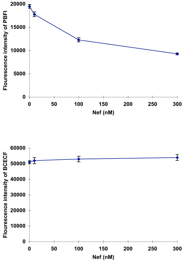 Figure 1. Alterations in intracellular K+ in T-lymphoblastoid cells incubated with recombinant HIV-1 and SIV Nef protein. H9 cells were loaded either with the K+ sensitive fluorescent indicated PBFI-AM (panel A) or the pH sensitive fluorescent indicator BCECF-AM (Panel B), then incubated with various concentrations of recombinant HIV-1 or SIV Nef protein for 15 min at 37°C, and fluorescence intensity was measured by using a fluorescence concentration analyzer. Each data point represents the mean ± standard error of eight independent determinations.