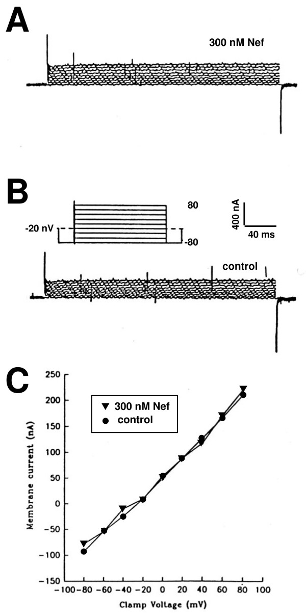Figure 3. Membrane currents in Xenopus oocytes exposed to Nef protein. (A) 300 nM recombinant Nef, (B) control oocyte Panel C: current:voltage plots determined from data recorded in panel A and B.