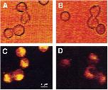 Figure 2. Fluorescent and light microscopic analysis of alteration in intracellular K+ concentrations in H9 cells treated with recombinant Nef. H9 cells were loaded with the fluorescent indicator PBFI-AM and incubated with 300 nM recombinant Nef protein or with control medium without Nef for 15 min at 37°C. Control cells (A and C) and cells incubated with Nef protein (B and D) were examined by light (A and B) and fluorescent (C and D) microscopy.