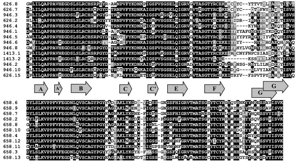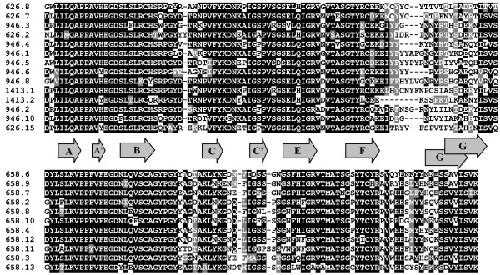 Figure 5. Alignment of deduced amino acid sequences of X. tropicalis D2 domains belonging to subgroups 1.1 and 1.2. The domains are designated according to the scaffold number (version 4.1) and consecutive position of a gene encoding that particular domain (Fig. 1.). Identical and similar residues are shown by white letters on black and gray backgrounds, respectively. Dashes represent gaps introduced to maximize similarity. Gray arrows indicate predicted β-strands forming Ig-like domain (A-G).