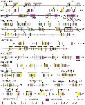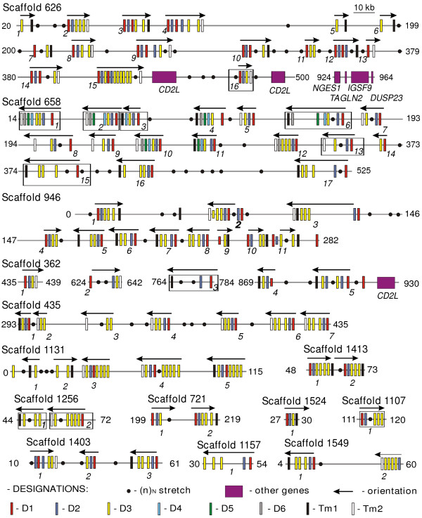 Figure 1. Genomic organization of the predicted X. tropicalis FcR-like genes. The exons for each particular subtype of the Ig-like domains (D1-D6) are marked by a different color as indicated. Exons for TMs with the NxxR motif (TM1) are in black and those for the TM regions without charged residues (TM2) are in white. The gene models supported by X. tropicalis EST cDNAs are boxed. Arrows indicate transcriptional orientation. The genes are designated by their scaffold number and their consecutive position at the corresponding scaffold (version 4.1). Filled circles show position of gaps in the assembly. To conserve space, only fractions of scaffolds are shown; their borders are indicated in kb at the right and left sides.