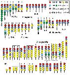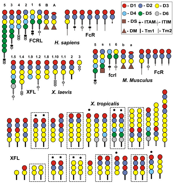 Figure 2. Schematic representation of domain architecture of human, mouse, Xenopus laevis and X. tropicalis FcR-like proteins. The structure of X. laevis molecules is deduced from cDNA sequences, whereas the structure of X. tropicalis molecules is predicted based on the genomic sequences and confirmed by the EST cDNA sequences (marked with asterisk). The Ig-like domains belonging to the D1-D6 structural subtypes are shown by circles and the TM regions by thick lines. Thin lines and rectangles designate cytoplasmic tails and YxxV/L/I motifs, respectively. The color pattern for the Ig-domains subtypes and transmembrane types are as in Fig. 1. Paired receptors with similar extracellular regions but distinct TM regions are boxed.
