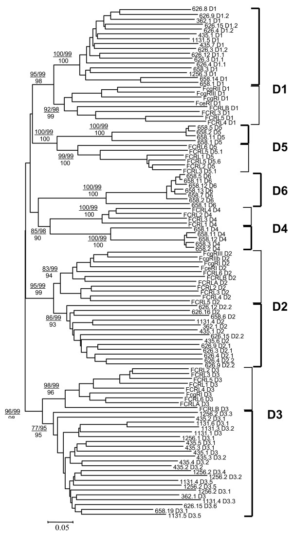 Figure 4. Neighbor-Joining tree based on the D1-D5 nucleotide sequences of X. tropicalis XFLs and human FcR and FCRL genes. X. tropicalis genes are designated according to a scaffold number and their consecutive position (See Fig. 1). For genes containing multiple exons for domains of the same type these exons are numbered according to their position (i. e. D3.1-D3.3). The tree was constructed using MEGA3 software with p-distances for nucleotide sequence sites and pair-wise deletion option. The numbers on the tree represent values for the bootstrap and interior branch tests after 250 replicates.