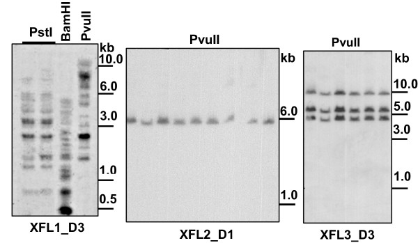 Figure 6. Southern blot analysis of Xenopus laevis genomic DNA. Hybridizing probes corresponded to the exons for D1 domain of XFL2 or D3 domains of XFL1.1 and XFL3.