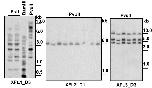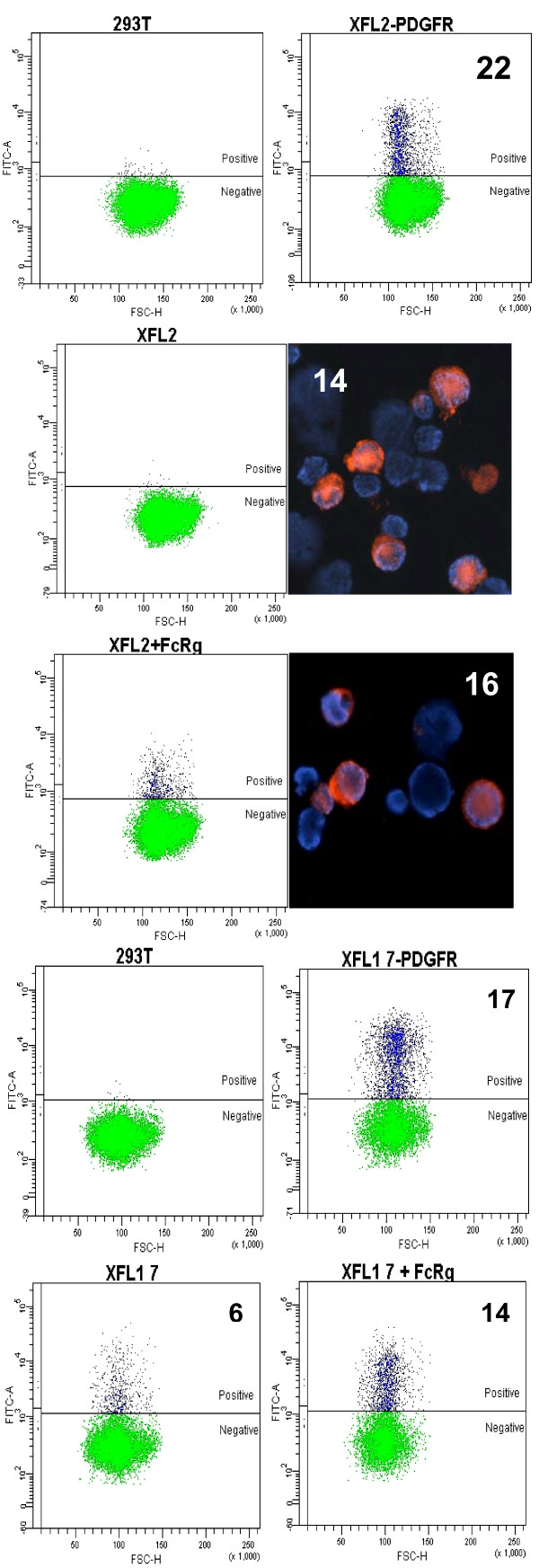 Figure 8. Requirements for the expression of XFL1.7 and XFL2 on the cell surface. Epitope-tagged XFL1.7 or XFL2 were ectopically expressed in their native forms, or with the TM regions replaced by that of PDGFR in transiently transfected 293T cells. Effect of co-transfection with FcRγ chain was also studied. Immunocytochemical staining of the XFL2-transfected cells is shown at right. Transfection efficiency is shown as percentage of antigen-positive cells.