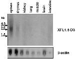 Figure 7. Northern blot analysis of XFL mRNA distribution in X. laevis tissues. Pooled total RNA from six 6-month old frogs were hybridized under low stringency conditions with the D3 exon of XFL1.5 as an universal probe for group I XFL genes.