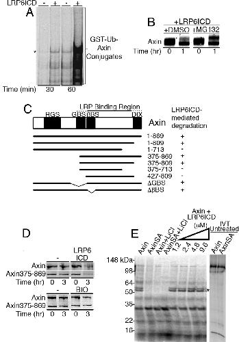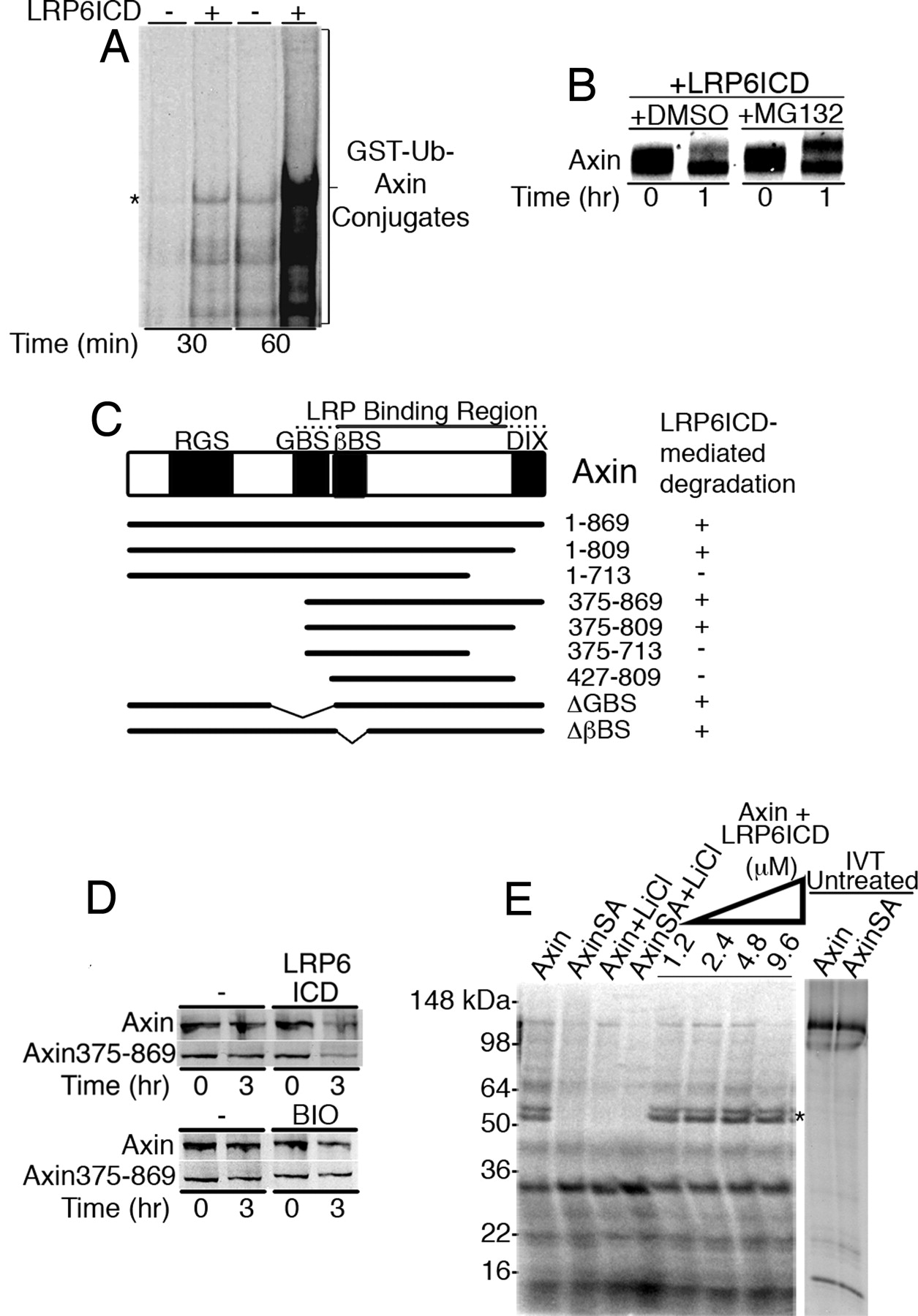 Fig. 2. LRP6ICD mediates Axin degradation independently of GSK3 inhibition. (A) LRP6ICD stimulates addition of GST-ubiquitin to radiolabeled, IVT Axin in egg extract. GST-ubiquitin conjugates were pulled down with glutathione beads at indicated times and analyzed by using SDS/PAGE and autoradiography. Asterisk indicates full-length Axin. (B) Addition of the proteasome inhibitor MG132 (1 mM) to egg extract inhibits LRP6ICD-mediated Axin degradation. (C) Degradation of Axin mutants in egg extract in the presence of LRP6ICD. The indicated LRP5/6-binding region on Axin is based on previous Axin-LRP5 and Axin-Arr yeast two-hybrid studies (6, 7); dotted lines represent large deletions of Axin that were not further mapped, and the borders of Axin-LRP5/6 interaction likely reside within the dotted lines. RGS, RGS domain; GBS, GSK3 binding site; βBS, β-catenin binding site; DIX, DIX domain. (D) LRP6ICD promotes degradation of Axin and Axin375â869, whereas the GSK3 inhibitor BIO (50 μg/ml, Calbiochem) promotes degradation of Axin but not Axin375â869. (E) Inhibition of GSK3-mediated Axin phosphorylation [by LiCl (50 mM) or mutagenesis (AxinSA)], but not incubation with LRP6ICD, alters the trypsin proteolysis pattern of IVT Axin after incubation in egg extract for 30 min (note bands at level of asterisk). All experiments used equal concentrations of IVT Axin. An SDS/PAGE autoradiograph of IVT Axin and AxinSA before trypsin treatment is shown at right.