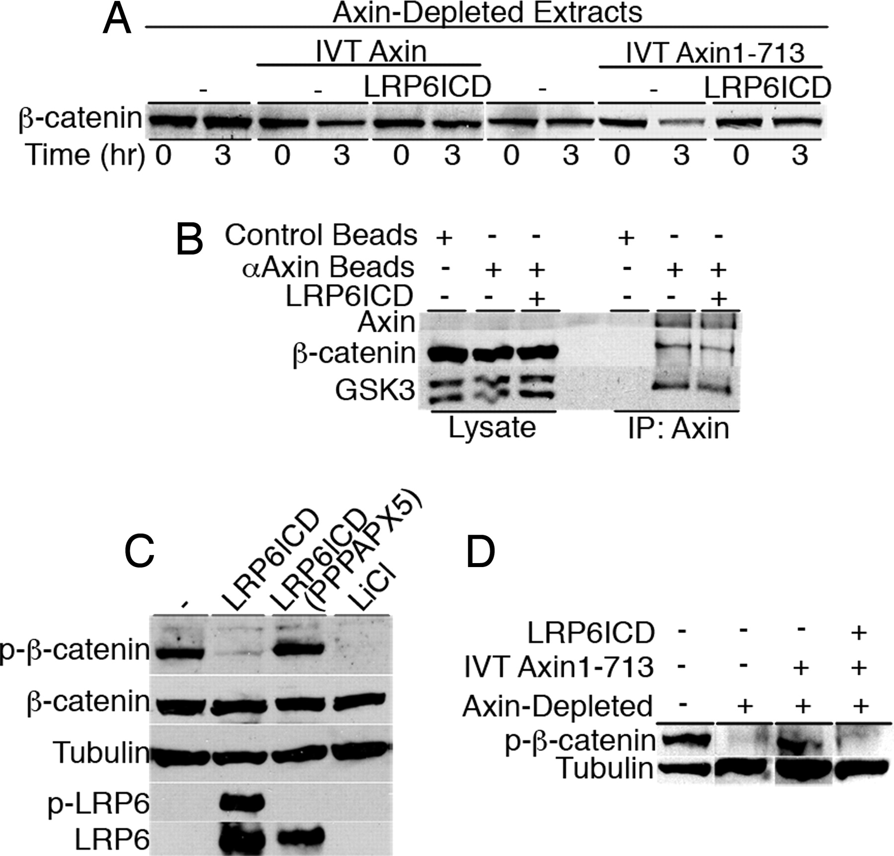 Fig. 3. LRP6ICD's inhibition of GSK3-mediated β-catenin phosphorylation is sufficient to promote β-catenin stabilization in the absence of Axin degradation. (A) LRP6ICD inhibits β-catenin degradation in extract where endogenous Axin is replaced by nondegradable Axin1-713. Addition of IVT Axin or Axin1-713 restores the ability of Axin-depleted extract to degrade radiolabeled β-catenin. LRP6ICD inhibits both IVT Axin and Axin1-713-induced β-catenin-degradation. (B) LRP6ICD does not affect the ability of Axin to bind GSK3 or β-catenin in egg extract. Endogenous Axin was immunoprecipitated from extract and immunoblotted for GSK3, β-catenin, and Axin. (C) Incubation of LiCl (50 mM) or LRP6ICD [but not LRP6ICD(PPPAPX5)] in egg extract (30 min) inhibits phosphorylation of endogenous β-catenin at GSK3 target sites P33/37/41. Immunoblot of LRP6ICD from the same gel reveals that LRP6ICD, but not LRP6ICD(PPPAPX5), is phosphorylated at the PPPSP Ser-1490. All samples were blotted from a single gel. (D) LRP6ICD inhibits GSK3-mediated β-catenin phosphorylation in extract in which endogenous Axin is replaced by nondegradable Axin1-713. Axin depletion did not affect total β-catenin levels as assayed by immunoblot (Fig. S7). Depletion of endogenous Axin prevents β-catenin P33/37/41 phosphorylation. Addition of IVT Axin1-713 restores β-catenin phosphorylation in Axin-depleted extract. LRP6ICD inhibits IVT Axin1-713-induced β-catenin phosphorylation. Extracts were analyzed after 2-h incubation. All samples were blotted from a single gel; intervening lanes were removed for clarity.