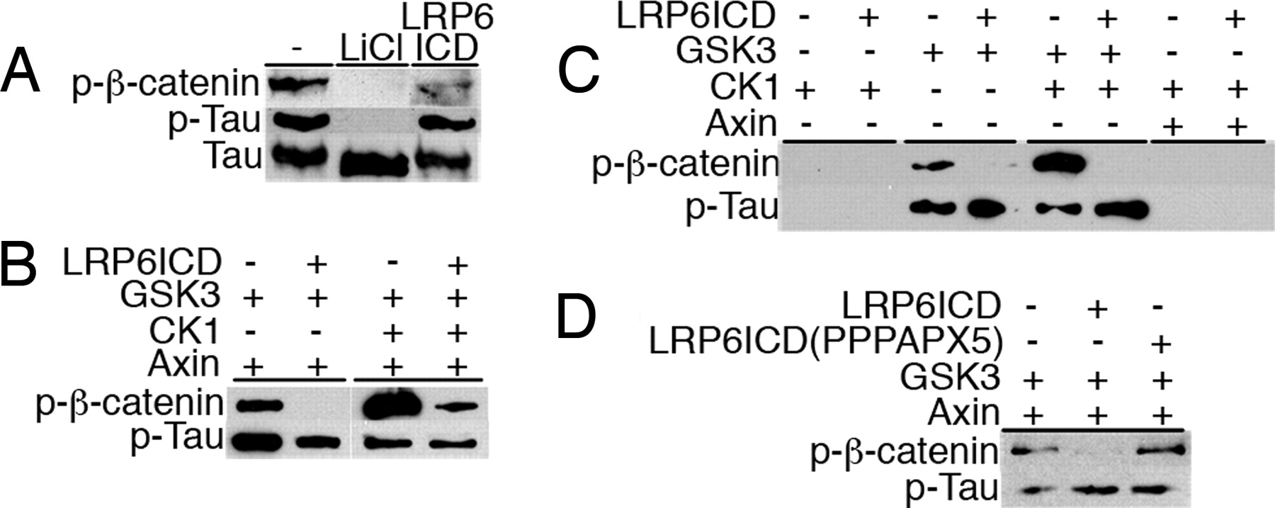 Fig. 4. LRP6ICD directly and specifically inhibits GSK3's phosphorylation of β-catenin. (A) LiCl (50 mM) inhibits phosphorylation of β-catenin P33/37/41 and exogenous Tau P396 by GSK3, whereas LRP6ICD inhibits phosphorylation of β-catenin, but not Tau, by GSK3. Extract was supplemented with GSK3 to enhance detection of phosphorylated Tau as previously described (32). β-catenin and Tau from the same reaction sample were immunoblotted from a single gel; intervening lanes were removed for clarity. (B) In an in vitro kinase assay containing purified, recombinant Axin (0.1 μM), GSK3 (0.79 μM), CK1 (1.37 μM), Tau (0.34 μM), and β-catenin (0.22 μM), LRP6ICD (4.1 μM) inhibits phosphorylation of β-catenin P33/37/41 by GSK3 without inhibiting the phosphorylation of Tau P396 by GSK3. (C) In a kinase reaction in which recombinant Axin is absent, phosphorylation of β-catenin by GSK3 is inhibited by LRP6ICD but not by LRP6ICD(PPPAPX5) (D). For (B), (C), and (D), β-catenin and Tau were incubated in the same reaction and immunoblotted from a single gel.