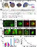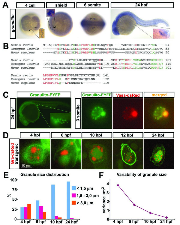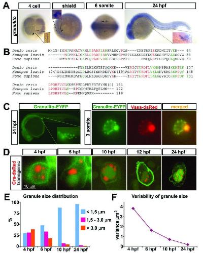 Figure 1. Expression pattern of granulito RNA and subcellular localization of the Ganulito protein. A) Whole-mount in situ hybridizations using granulito antisense RNA probe at the indicated stages. granulito is enriched at the region where the germ plasm resides (cleavage furrows, arrowheads) and is expressed in the primordial germ cells at later stages (arrowheads). B) Alignment of the zebrafish Granulito protein with those from Xenopus leavis and Homo sapiens. Red signifies conservation in all 3 species, green labels conserved substitutions. C) Subcellular localization of Granulito-EYFP. Granulito localizes specifically to germ cell granules as it colocalizes with Vasa protein. D) Germ cells of kop-granulito-dsRedex-nos1-3'UTR transgenic fish whose membrane and nucleus are labeled in green (except for the 4 hours stage where the nucleus is not labeled). Initially, germ cell granules with a large variety of sizes are observed. As development proceeds, the variation in germ cell granule size decreases. E) Granule size distribution at different stages. F) Variance of granule size at different stages. N >100 granules for each time point.