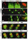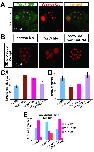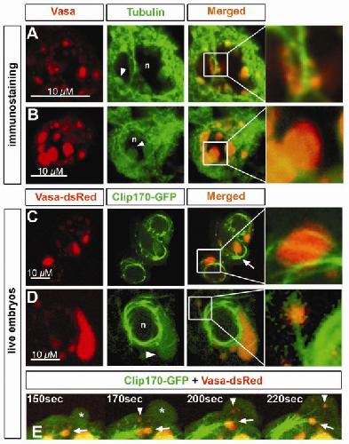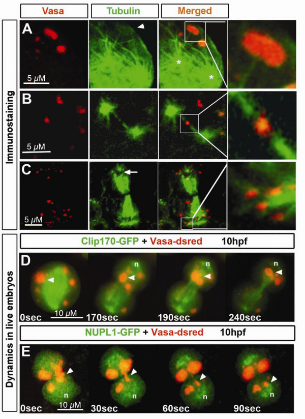 Figure 5. Microtubules localization relative to germ cell granules during different stages of germ cell mitosis. Immunostaining of germ cells undergoing cell division. Granules are labeled with anti-Vasa antibody and microtubules with anti-α-Tubulin antibody. A) During beginning of mitosis, α-Tubulin- expressing granules (arrowhead) appear connected to microtubular fibers (detail) projecting from what appear as centrosomes (asterisks). B) At a later stage of mitosis, when the two presumed centrosomes are located at the poles of the cell, projecting spindle microtubules reach at Vasa and α-Tubulin expressing granules (detail). C) When mitosis is close to termination, granules are enriched around the area where the nucleus reassembles (arrows). Specific colocalization of granules with astral microtubules is shown in detail. D) Germ cell granules (arrowhead) move towards the forming nucleus (n) through a path of spindle microtubules. E) Granules move to the area where the nucleus forms. Nuclear envelope reassembly was visualized by NUPL1. Elongated granules (arrowhead) move from the cytokinetic region to the site of the forming nucleus (n) and re-adopt a spherical shape upon arrival All experiments were performed on 10 hpf embryos.
