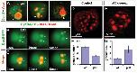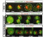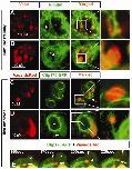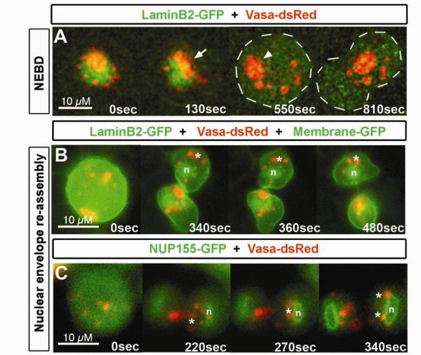 Figure 2. Germ cell granule behavior during cell division in live embryos. A) During interphase and before nuclear envelope breakdown (NEBD), the granules (labeled with Vasa-dsRed) show an organized localization around the nucleus (visualized with LaminB2-GFP). During early prophase, the nuclear envelop disassembles and germ cell granules change their shape (arrow). Once the envelope is completely disassembled granules that changed their shape readopt their spherical shape (arrowhead). All granules spread in the cytoplasm and are segregated into daughter cells. B) After cytokinesis, the nuclear envelope reassembles (n) and a group of granules spread in the cytoplasm readopt perinuclear localization (asterisk). Granules are labeled with Vasa-dsRed, nuclear envelope with LaminB2-GFP, and plasma membrane with farnesylated GFP. C) Movement of granules towards the nuclear envelope labeled with NUP155-GFP and visualized by confocal microscopy. Granules move directly (asterisk) to the area where the nuclear envelope is reassembling (n) during cytokinesis. All movies were recorded in 10 hpf embryos.