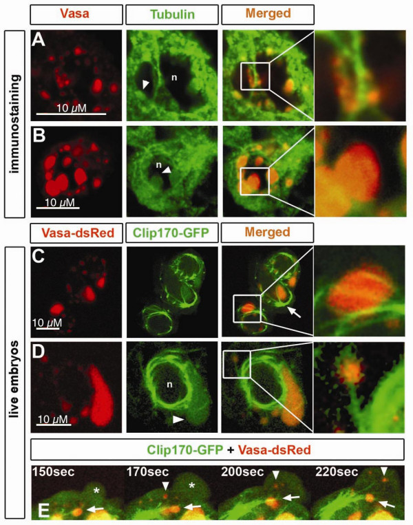 Figure 3. Microtubules colocalize with germ cell granules. A) Immunostaining of Vasa protein and α-Tubulin in germ cells of 6 hpf embryos. Perinuclear granules attached to microtubules are shown in detail. n and arrowhead depicts the nucleus and granules expressing Tubulin, respectively. B) At 16 hpf, germ cell perinuclear granules show expression of α-Tubulin within their structure (arrowhead). Nucleus is depicted by n. Pinhole value is 1.22. C).Germ cells in live 11 hpf embryos have a microtubular cage surrounding the nuclei, where microtubules originated from the MTOC (arrow) span the granules (detail). Microtubules were labeled with Clip170- GFP, and granules with Vasa-dsRed. D) Cytoplasmic granules colocalize with microtubular fibers projecting from the nuclear cage (detail). Tubulin expression is also found within the granule (arrowhead) of 11 hpf embryos. Nucleus is depicted by n. E) A close-up view of a germ cell of a 11 hpf embryos reveals flow of cytoplasmic granules not associated with microtubules (arrowhead) into the protrusion (asterisk) while others remain stable in colocalization with microtubules projected from the MTOC (arrow).