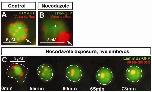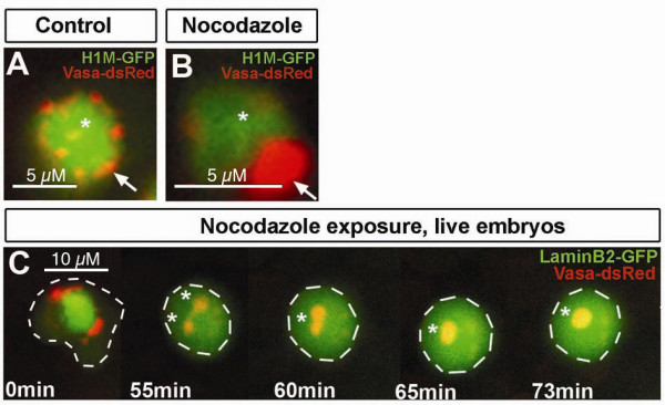 Figure 4. Granules structure is affected after microtubule disruption. A) Confocal section of germ cells in control embryos exposed to DMSO for 6 hours. Germ cell granules show normal perinuclear localization and distribution into small structures (arrow). B) Confocal section of germ cells in embryos exposed to 1 μg/ml of nocodazole for 6 hours. Nocodazole treated cells exhibit a conglomeration of Vasa positive granules forming a large granule (arrow). C) Embryos exposed to same conditions mentioned above. Vasa-dsRed labels granules, LaminB2-GFP labels nuclear envelop. The experiment shows how after laminB2 network disassembles, individual granules fuse forming bigger structures (asterisk). Cell outline is depicted with white dashed lines. All experiments were done in 11 hpf embryos.