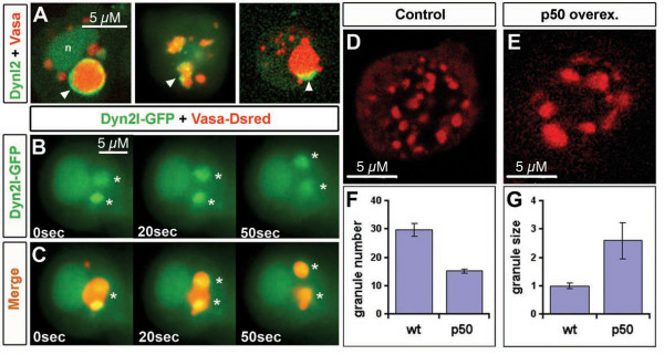 Figure 6. Dynein localize to germ cell granules and is involved in granule fragmentation. A) DynL2-GFP is localized to nucleus, cytoplasm and to germ cell granules. Granule DynL2-GFP localization patterns are diverse, ranging from ring-like structures around large granules (left panel, arrowhead, nucleus is depicted by n), dots within the granules (arrowhead, middle panel) or accumulations can also be observed on the periphery of such structures (arrowhead, right panel). Interphase cells where analyzed in 6 to 10 hpf embryos. Note that Vasa-dsRed and DynL2-GFP colocalization preferentially occurs in the largest granule of the cell. B) Germ cells of 9 hpf embryos expressing DynL2-GFP were analyzed in vivo by epifluorescence microscopy. DynL2-GFP is localized to a large germ cell granule where two centers of high concentration are observed preceding the division of the granule (asterisks in B,C). C) Merge of B together with Vasa-dsRed to visualize the granules. D) Immunostaining of control germ cells of 24 hpf embryos showing the normal number (shown graphically in F) and size (shown graphically in G) of Vasa expressing granules n = 33 cells and 191 granules (G). Dynein inhibition in germ cells of 24 hpf embryos by p50 overexpression reduces the number of granules per germ cell while the size of germ cell granules increases. n = 116 cells and 154 granules (E,G). TTtest for F: p < 1E-8. TTest for G: p < 1E-14.