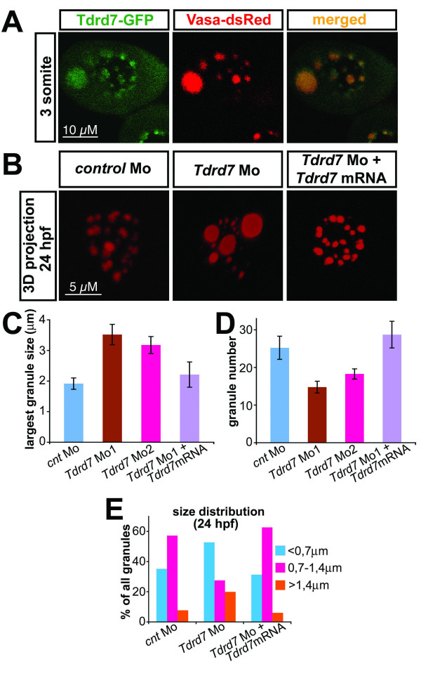 Figure 7. Tdrd7 function is required for proper germ cell granule architecture. A) Tdrd7-GFP fusion protein colocalizes with the germ cell granule marker Vasa-dsRed. A 3-somite stage embryo corresponds to 11 hpf embryo. B) Tdrd7 function is required the formation of uniform normal sized granules. A 3D projection of granules labeled with Vasa antibody in 24 hours old control cells (left panel), in Tdrd7 depleted cells (middle) and in cells from embryos co-injected with the antisense oligonucleotide directed against Tdrd7 and an RNA encoding Tdrd7 that is resistant for the inhibition by the antisense oligonucleotide (right). C) Size of the largest granule in 24 hpf PGC. N = 18 cells for control, 16 for morpholino 1 injected embryos (T-test compared with the control, p < 10-3), 19 for morpholino 2 and 16 cells in which the phenotype was reversed by co-injection of the morpholino resistant Tdrd7 RNA. D) Number of granules in 24 hpf PGC. N = 13 cells for control, 19 cells for morpholino 1 (T-test compared with the control, p < 10-2), 26 cells for morpholino 2 and 13 cells in which the phenotype was reversed by co-injection of the morpholino resistant Tdrd7 RNA., TTest p < 0,003). E) Granule-size distribution is increased in cells knocked down for Tdrd7 as the proportion of the very small and very large granules is increased. N = 223 granules for control, 150 granules for morpholino 1 and 132 granules in which the phenotype was reversed by co-injection of the morpholino resistant Tdrd7 RNA.
