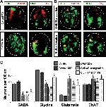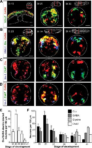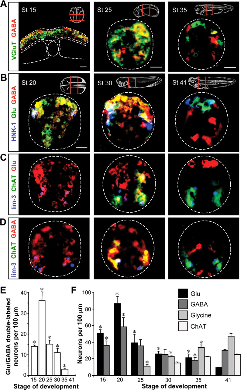 GABA and Glu are promiscuously expressed before synapse formation. A, Immunostaining for GABA and VGluT1 demonstrates expression within neural tissue at the neural plate [stage (St) 15], early tailbud (St 25), and late tailbud (St 35) stages. Insets indicate regions from which sections were taken. White dashed lines identify the margins of the neural plate, notochord, somites, and neural tube. B, Triple immunostaining reveals GABA and Glu in HNK-1-immunoreactive Rohon-Beard neurons at the early neural tube (St 20) and tailbud (St 30) stages that will become glutamatergic at 3 d of development (St 41). C, Triple staining for lim-3 with ChAT and glutamate shows transient expression of glutamate in motoneurons that later become cholinergic. D, Triple staining for lim-3 with ChAT and GABA reveals transient expression of GABA in motoneurons. E, Time course of the changes in glutamate/GABA coexpression during the development of the embryonic spinal cord. F, Quantification of transmitter expression dynamics for Glu, GABA, glycine, and acetylcholine (assayed as ChAT immunoreactivity) per 100 μm of spinal cord at different stages of development. Scale bars: A, B, 20 μm. n ⥠3 embryos for AâF. E, F, Values are mean ± SEM; asterisks indicate a significant difference from stage 41.