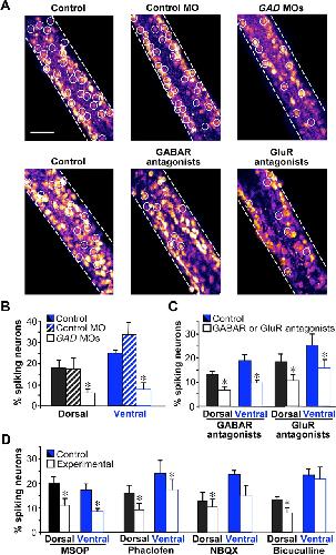 Blocking GABAergic or glutamatergic signaling decreases the incidence of calcium spike activity. A, Calcium spike incidence (white circles) on the ventral surface of the neural tube of control, control MO, and GAD65 plus GAD67 MO (GAD MO)-injected embryos or in the presence of pooled GABAR or GluR antagonists. Scale bar, 50 μm. B, C, Spike incidence is reduced dorsally and ventrally in GAD65/67 MO-injected embryos and by pooled GABAR or GluR antagonists. D, Calcium spike incidence in the presence of single receptor antagonists. n ≥ 5 stage 25–28 embryos for each condition. Values are mean ± SEM; asterisks indicate a significant difference from control.