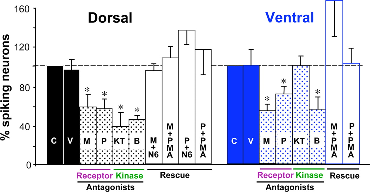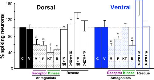 PKA or PKC antagonists mimic the effect of metabotropic receptor antagonists on spike incidence, and the effect of receptor antagonists is reversed by kinase agonists. Values are normalized to controls for each treatment. C, Control; V, vehicle control; M, MSOP (mGluRIII antagonist); P, phaclofen (GABABR antagonist); KT, KT5720 (PKA antagonist); B, bisindolylmaleimide (PKC antagonist); N6, N6-benzoyl-cAMP (PKA agonist); PMA, phorbol myristic acid (PKC agonist). Embryos at stages 25–28 are shown. n ≥ 5 embryos for each condition. Values are mean ± SEM; asterisks indicate a significant difference from control. Calcium spike activity showed no significant difference when reagent vehicle was applied alone.