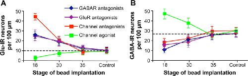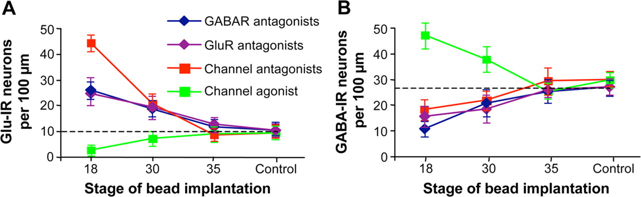 GABA- and glutamate-driven activity-dependent transmitter expression is restricted to a sensitive period. Beads containing agents to block GluR or GABAR (as in Fig. 2) or to suppress or enhance voltage-gated channel activity (Borodinsky et al., 2004) were implanted at various developmental times and larvae were fixed and transmitter expression scored at 3 d of development [stage (St) 41]. Similar results were obtained after fixation of embryos at a constant interval of 2 d after bead implantation (data not shown). A, GluR and GABAR antagonists increase the number of Glu-immunoreactive neurons during a period of ∼15 h from St 18 to St 30; suppressing or enhancing voltage-gated channel activity increases and decreases the numbers of Glu-immunoreactive neurons during the same period. B, GluR and GABAR antagonists decrease the number of GABA-immunoreactive neurons during this period; suppressing or enhancing voltage-gated channel activity decreases and increases the numbers of GABA-immunoreactive neurons. Dashed lines indicate control values. Transmitter expression after bead implantation at St 18 or 30 is significantly different from control. Changes in transmitter expression after bead implants at St 30 or 35 are significantly smaller than those obtained when beads are implanted at St 18, except for GluR beads at St 30. n ≥ 5 embryos for each condition. Values are mean ± SEM and are connected by lines according to the type of bead implanted.