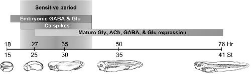 Model for GABA/glutamate-activated Ca spike-mediated transmitter specification. GABA and glutamate are promiscuously expressed early in development. During a sensitive period, these transmitters activate receptors to trigger Ca spikes that specify transmitter expression at later stages.