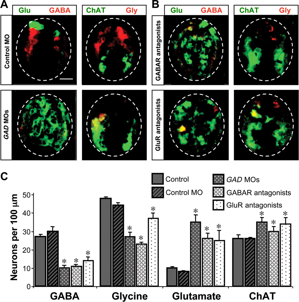 Blocking GABAergic or glutamatergic signaling changes neurotransmitter expression. A, Immunostaining for Glu/GABA and ChAT/Gly in 3 d larvae (stage 41) developed from embryos injected with control morpholino (control MO) or GAD morpholinos (GAD MOs) at the two-cell stage. Scale bar, 20 μm. B, Immunostaining is as in A of larvae from embryos implanted with beads containing antagonists of GABAR (bicuculline and phaclofen) or GluR (D-AP5, NBQX, MSOP, and MCPG). C, Number of neurons expressing different transmitters at 3 d of development after suppression of GABAergic or glutamatergic signaling. n ≥ 5 embryos for each condition. Values are mean ± SEM; asterisks indicate a significant difference from control.