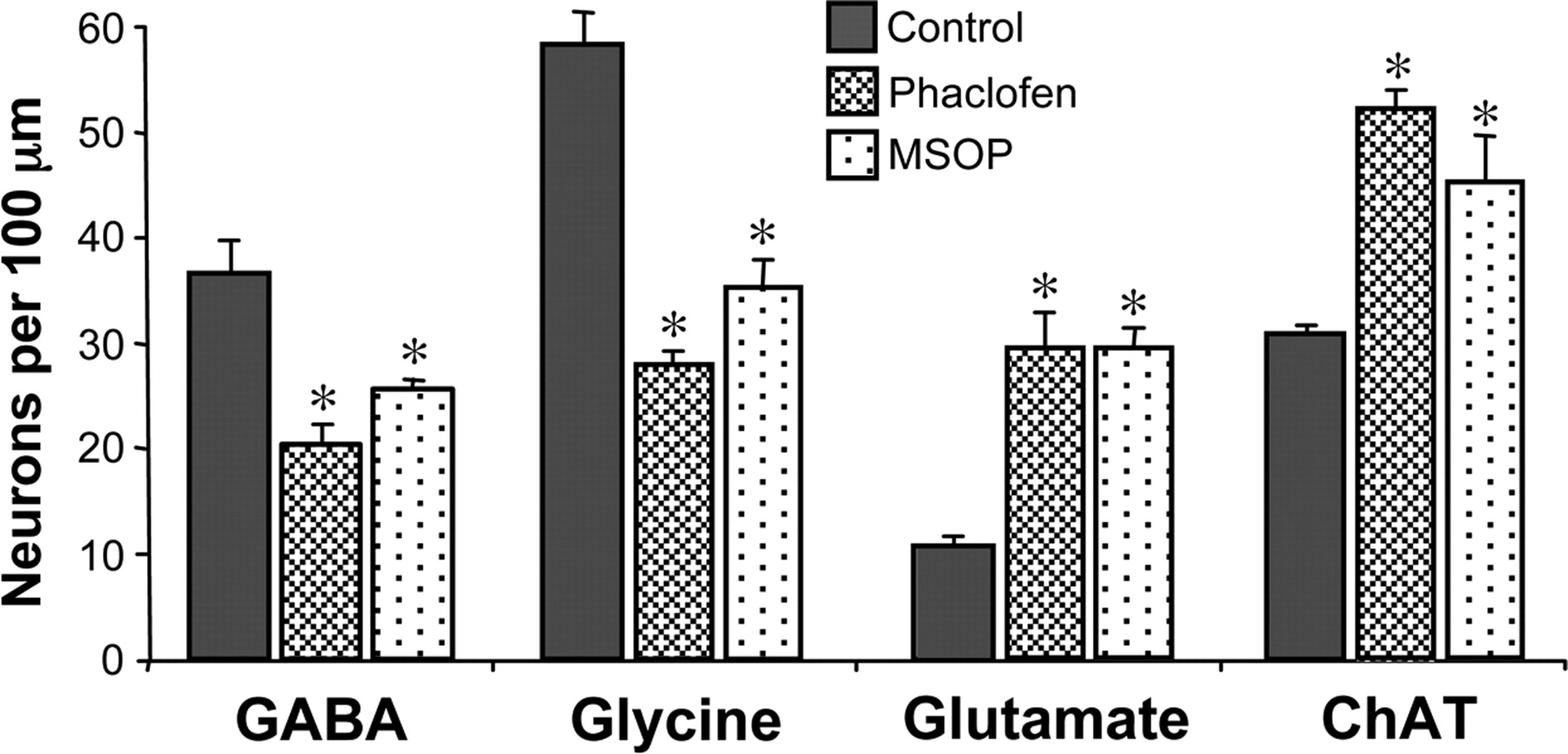 Blocking GABAB or mGluRIII receptors changes neurotransmitter expression. Number of neurons expressing different transmitters at 3 d of development after suppression of GABAB or mGluRIII signaling. Immunostaining was performed on 3 d larvae (stage 41) developed from embryos implanted with beads containing antagonists of GABABR (phaclofen) or mGluRIII (MSOP). Control embryos were interleaved in parallel. n ≥ 4 embryos for each condition. Values are mean ± SEM; asterisks indicate a significant difference from control.