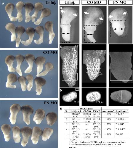 (C) Transverse confocal section through the dorsal axis of an embryo injected contralaterally with FNMO along with a FITC-dextran lineage tracer shows the absence of fibrils is accompanied by tissue thickening on the injected side.